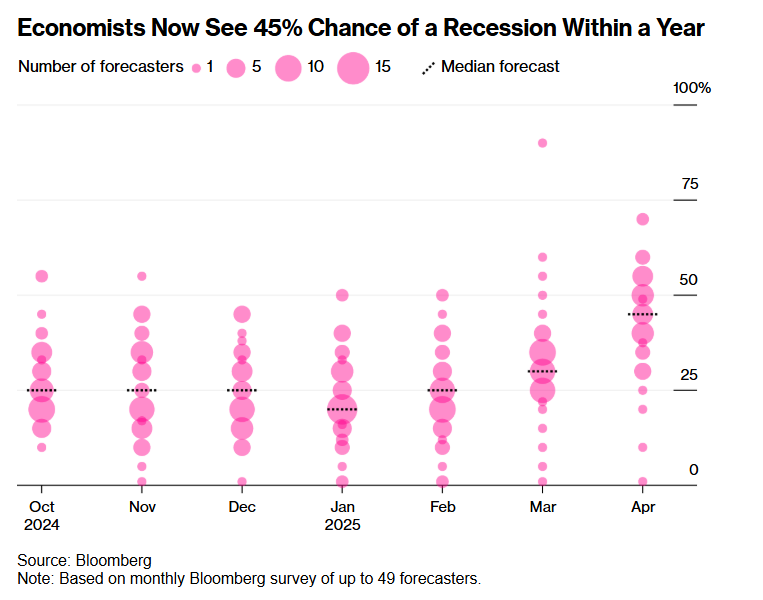 彭博社最新的调查报告显示,受到特朗普政府掀起的面向全球的关税战役冲击,接受咨询与访问的知名经济学家们普遍认为,在新一轮全球贸易博弈以及中国、欧盟与加拿大等经济大国因美国关税政策而陷入所谓的“贸易拉锯战”,未来12个月美国陷入经济衰退的概率已从3月调查所显示的30%跃升至45%,这也意味着美国经济陷入衰退的概率几乎等同于扔硬币。