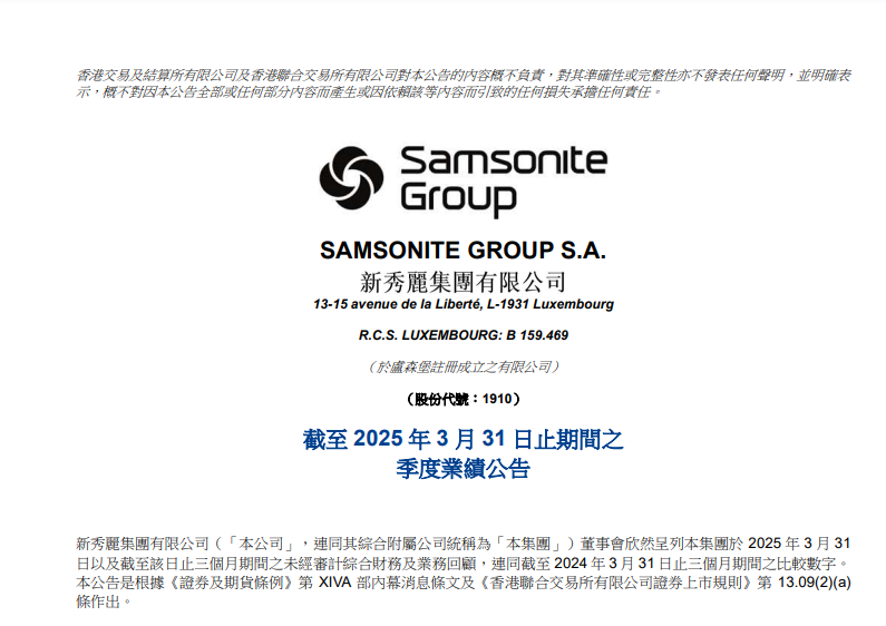 公告称,公司于2025年第一季度的销售净额受到亚洲销售净额下降、北美洲消费者信心下降,以及北美洲批发渠道销售净额时间变动(此令2024年第四季度的销售净额表现受惠,对2025年第一季度的业绩产生负面的影响)所影响。该等因素部分被American Tourister和TUMI品牌的销售净额同比增长带动的欧洲销售净额增长所抵销。
