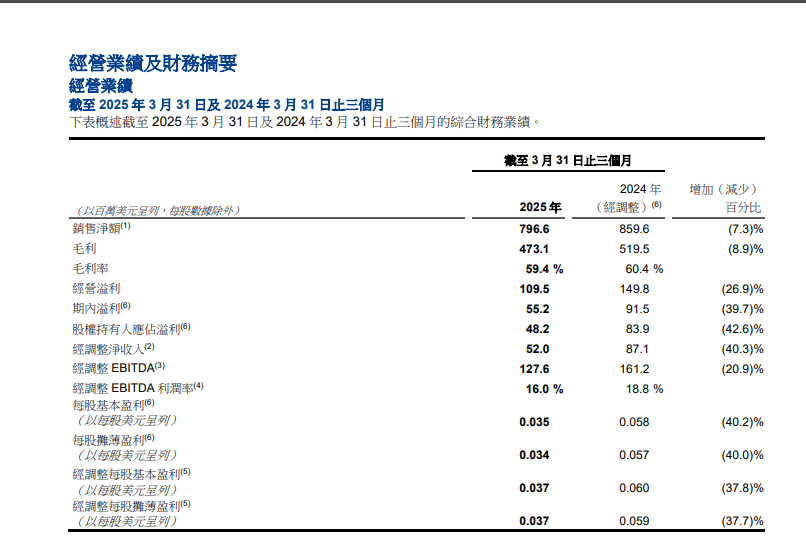 5月13日,新秀丽(HK01910)发布公告,披露截至2025年3月31日三个月的财务业绩。公司在此期间的销售净额为7.97亿美元,相较于2024年同期的8.6亿美元下降了7.3%(按不变汇率基准计算则下降4.5%)。