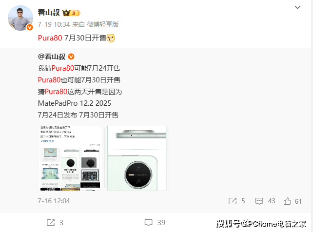 此前,已有消息灵通人士“看山叔”透露,华为Pura 80标准版预计将于7月30日正式上市,并强调其价格将极具竞争力。据悉,这款新机配备了一块6.6英寸的LTPO屏幕,分辨率高达2760*1256,并支持120Hz的高刷新率,为用户带来极致的视觉体验。存储方面,Pura 80标准版提供了最高可达12GB+1TB的存储组合,满足用户对大容量的需求。